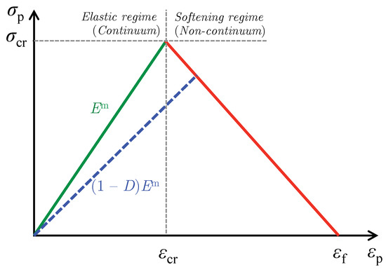 where, and is the maximum principal stress and principal strain, respectively, the maximum separation where corresponds to the strain corresponding to complete failure of the material (accompanied by complete loss of stiffness). Here, h is the characteristic element length that preserves mesh objectivity (see Jirasek and Bazant [15]), by prescribing a normalized value of for each element such that . Consequently, the value of equals the area under the law as shown in Figure 6. In the finite element procedure, the finite element sizes were kept more or less uniform in all the unit cells considered. The characteristic length h is computed for each element via Abaqus’s internal characteristic element length CELENT variable (Abaqus [16]). The value of was chosen to be 0.002 N/mm in all the computations, whereas the tensile fracture strength was chosen to be 55 MPa. From the crack band model formulation, the damage parameter due to softening is denoted as D where . For a material with initial matrix stiffness now in the softening region of the traction-separation law, D is computed as: