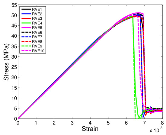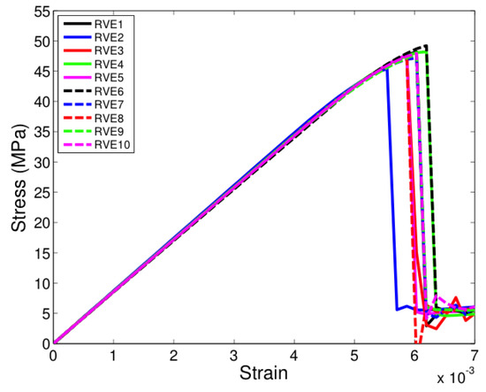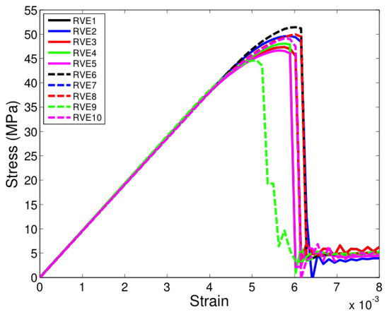 All the unit cells were loaded under tension in the two-direction, that is, along a direction transverse to direction of fibers seen in Figure 5. Figure 7, Figure 8 and Figure 9 show the stress-strain response of six-fiber unit cells for fiber volume fractions 0.4, 0.5 and 0.6 respectively. Figure 10 and Figure 11 show the stress–strain response of 24-fiber and 40-fiber unit cells with fiber volume fraction 0.5. All these response plots exhibit similar behavior except that there is a scatter in the peak stress values owing to effect of fiber packing. Fiber packing affects the stress–strain response in that the development of tensile stresses in different regions is governed by the manner in which the fibers are distributed within the unit cell, hence the scatter. During the initial stages of loading, the unit cell exhibits a linear response followed by a peak and the response is governed only due to the elastic properties of the constituents. Before the peak is attained, there is some nonlinearity in the response caused when some of the matrix elements reach their critical tensile strength and enter the softening regime. When sufficient matrix elements enter the softening regime, a sharp two-piece crack develops. This crack is oriented approximately perpendicular to the loading direction and the formation of this crack controls the peak of the stress–strain response of each of the unit cells. In the elements that were in the softening path of the traction–separation law, the minimum stiffness was not allowed to fall below 2% of the original stiffness in the simulations to prevent excessive distortion in the elements. Therefore, the slight stress increase seen after the drop is a modeling artifact and not relevant to the analysis after the drop has occurred beyond the peak.