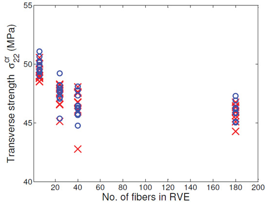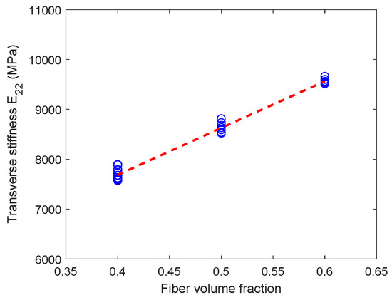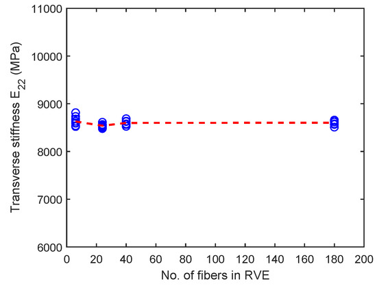 Figure 15 shows the variation of transverse stiffness for the six-fiber unit cell case but for varying fiber volume fractions. As expected, there is a clear increase in the transverse stiffness for increasing fiber volume fraction. However, from Figure 16, no variation can be seen in the transverse stiffness of the unit cell as the unit cell size increases. This behavior is controlled by only the elastic properties of the constituents and is different from the observations in Figure 14 for the transverse tensile strength values, which depend on the matrix softening response. Moreover, the scatter in transverse tensile strength for a given type of unit cell is appreciably higher than scatter in transverse stiffness. This behavior can be explained due to the fact the stiffness is an average property of the constituents and is less sensitive to the distribution of fibers inside the unit cell, whereas the strength is controlled by extreme values of maximum principal stress developed in the matrix regions, which in turn, is controlled by fiber packing.