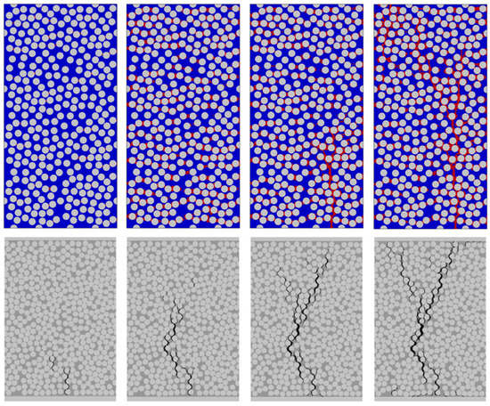 Figure 17 shows a long 320-fiber unit cell subjected to transverse tension, starting with damage initiation to two-piece crack formation. Qualitative comparison is made with numerical results corresponding to a 90 layer inside a [] laminate (Herráez et al. [19]). In [19], in addition to matrix model, there was provision for fiber–matrix interface decohesion. It was reported that failure always initiated at the fiber–matrix interface and then this crack propagated and branched out through the thickness. In our simulations, the two-piece crack is seen to propagate similar to what is reported in [19]. In the present case, damage always occurred in the vicinity of the fiber, where there is stiffness mismatch between fiber and matrix properties and non-uniformity in maximum tensile stress field. Subsequent crack propagation through the thickness also showed the presence of crack-branching, which is also seen in the study by Herráez et al. [19].