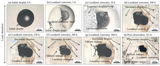 | A | U-bend, 1% NaCl-droplet 99% RH, RT. | 311 h | Localized corrosion | 106 |