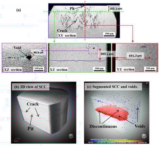 - Localized corrosion was featured by an irregular pit with deposited corrosion products containing cracks; while the SCC was observed to be initiated from a corrosion pit and propagated with a 3D tortuous and discontinuous morphology that might be segmented by some voids, rather than the pseudo-continuous from 2D characterization.