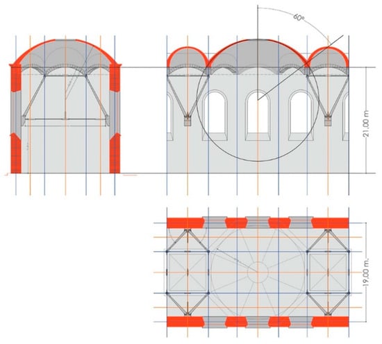 The lateral force will be H1 = 0. These moments have not been considered because during the construction phases (fully explained below), the crosspieces for eliminating horizontal thrusts are positioned before building the arches and, therefore, the domes. Thus, the domes cannot provide any destabilizing moment to the walls.