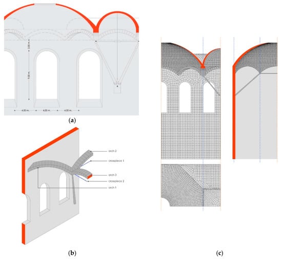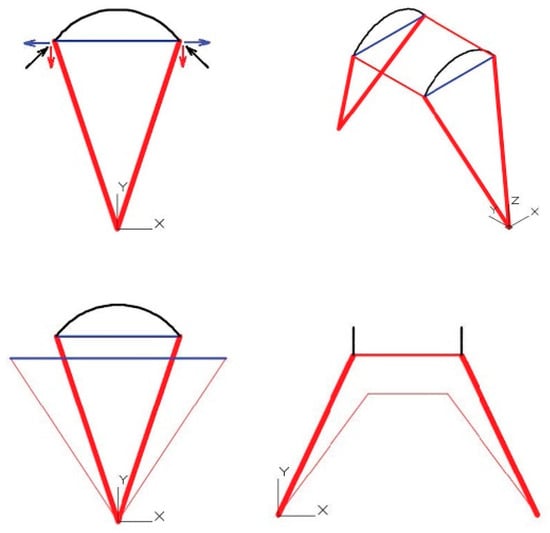 In Figure 4, drawn in blue is the crosspiece, which will be under traction due to the arch. The other elements will remain under compression. The elements under compression are those that bring loads towards the wall by way of the arch [8].