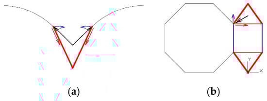 (a) Diagram in section view of the operation of the vault thrust; (b) diagram in plan view of the operation of the vault thrust.