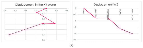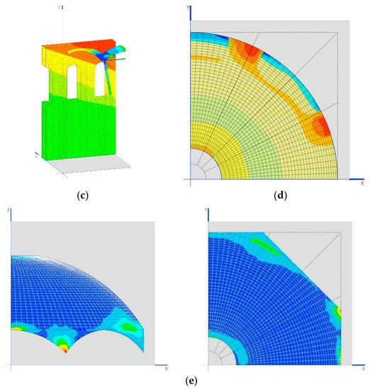 The construction process alleviates the tensions on the dome by up to 0.6 MPa (without considering small amounts of 1 MPa on the tympanums), especially in sensitive areas such as the skylight, where the traction practically disappears (Figure 14a–e).