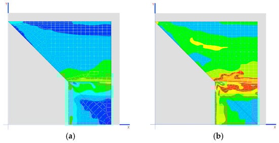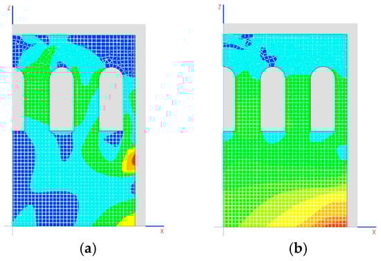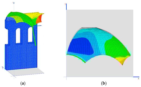 The breaking limit for mortar has been taken as 0.3 MPa. The areas that appear as having the greatest tension are shown in a transparent color in Figure 15b. The main tension is in the direction of the horizontal plane, with a maximum of 0.5 MPa (Figure 16a).