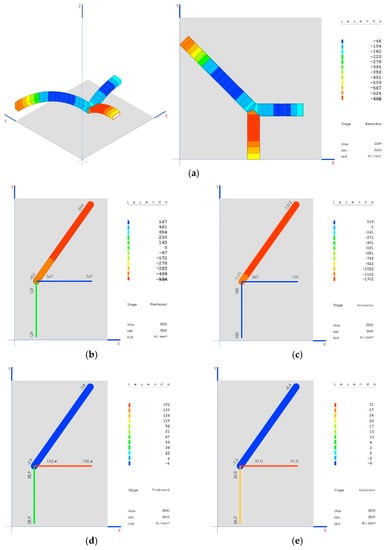 The stresses on these elements vary significantly depending on the construction phase, as shown for prestressed (Figure 19b) and final (Figure 19c). These remain much lower than the elastic limit at all times (175 MPa): prestressed, Figure 19d; final, Figure 19e.