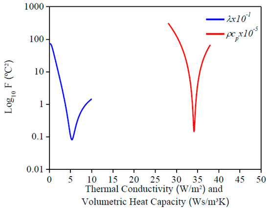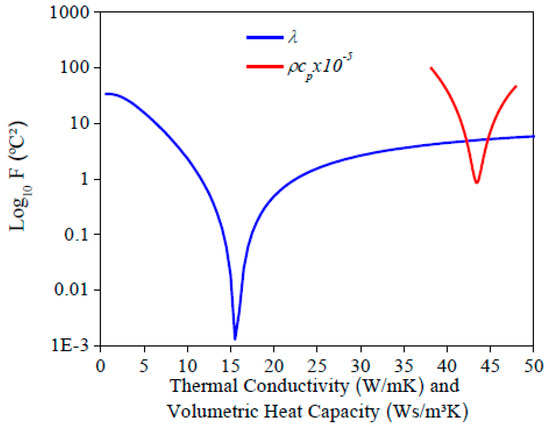 The evaluation of Equation (6) for each property is shown in Figure 4. λ and ρcp were estimated simultaneously due to a minimum value for each property. It is important to inform that the contact resistance of the heater on the sample was considered in Equation (6) to find its influence on the temperature measurements. In this study, a temperature difference of 0.23 °C corresponded to the influence of this contact resistance.