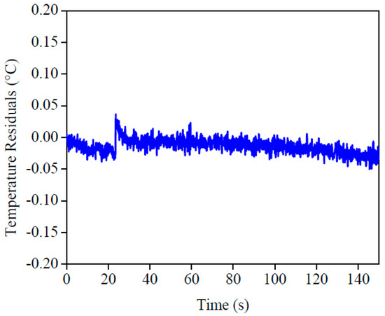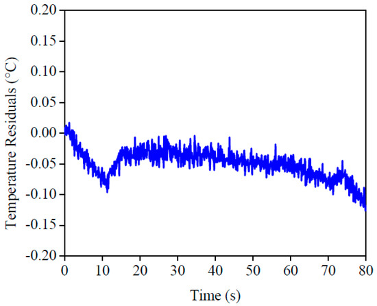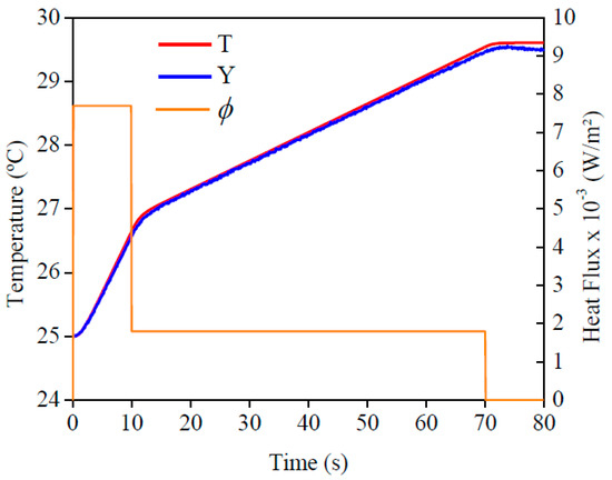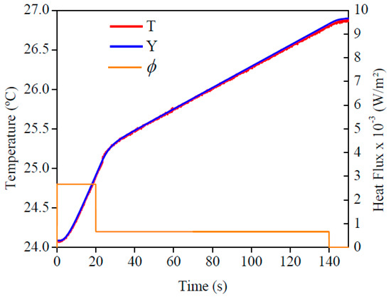 The imposed heat flux and the temperatures are presented in Figure 13. By analyzing this figure, one can see the good concordance between the temperatures. To validate this affirmation, the temperature residuals, where the maximum deviation was 0.05 °C, are presented in Figure 14. If this value was compared to the temperature difference, around 3 °C, one could see the good quality of the obtained results.