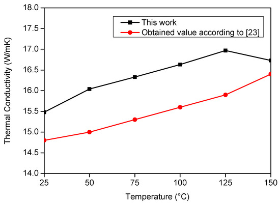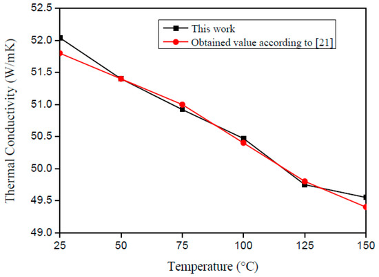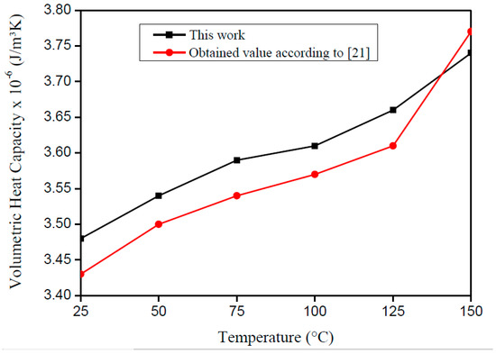 Figure 8 and Figure 9 present the literature and experimental result values. One can see the good agreement of the curves, which present a correlation factor of 0.98 for λ and 0.99 for ρcp. In accordance with Montgomery and Runger [22], the correlation factor indicates a quantitative measurement between two factors. Moreover, when the correlation factor presents value from +0.9 up to +1.0, it is possible to say that the correlation is direct and reliable.