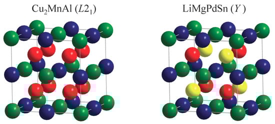 Heusler compounds are known to crystallize not only in centrosymmetric structures, but also in structures without an inversion centre. Examples include the structure (MgAgAs, cF12, (216)) of compounds, and the X-type (LiAgSb) and Y-type (LiMgPdSn, cF16, (216)) structures. For the quaternaries, mainly the cubic Y-type is significant as a structure without an inversion centre. Additionally, this structure is related very closely to the Heusler structure, except for the lack of inversion symmetry, as shown in Figure 1. Further, the Y-type structure is also obtained when filling the vacancy of the ternary structure by a fourth, different atom. Moreover, in many cases, the electronic structure of the centrosymmetric Heusler compounds and that of compounds with non-centrosymmetric LiMgPdSn structure are shown to be quite similar.