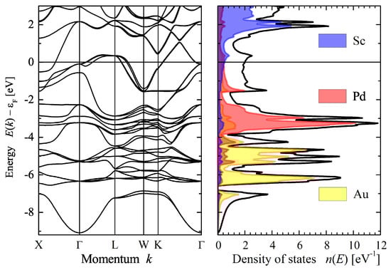 Here, the electronic structure of AuPdScAl will be discussed. Additional band structures for other compounds can be found in the supplemental material (Figures S1–S8). Figure 2 shows the calculated electronic structure of AuPdScAl. The splitting of d bands caused by the spin–orbit interaction is clearly visible, and it is also clear that the d states of the transition metals split from each other (Pd from about −3.5 to −2 eV and Au from −6.5 to −4 eV). As expected, the larger splitting was observed for the Au d bands. All localized d states were further away in energy (below −2 eV) from the Fermi energy, and the bands crossing mainly had a delocalized character. Two van Hove singularities appeared close to the Fermi energy: one at ( symmetry) and another saddle point at L ( symmetry). The former was just below but did not significantly contribute to the density of states , owing to the rather free electron character of the bands and the missing degeneracy of the point. The states had a four-fold degenerate character. The other eight-fold degenerate singularity at L resulted in the local maximum of at approximately 350 meV above , which is similar to the van Hove singularity observed in the Pd-based Heusler compounds []. Here, the two states with the and character arose from the splitting (2 meV) of a former e state (note: e is the two-fold degenerate irreducible representation of the cubic group ).
