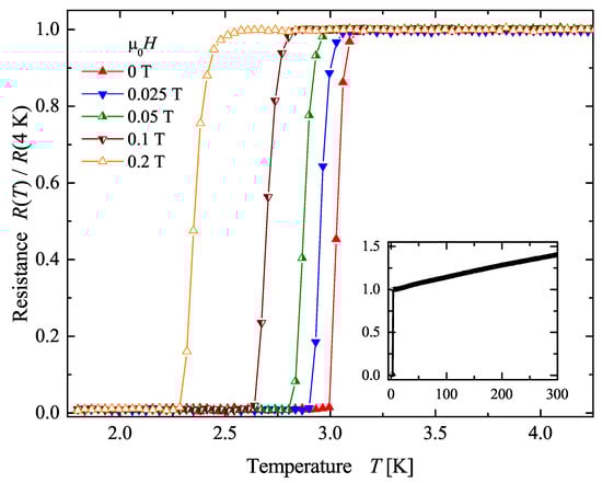 Temperature dependent resistance measurements were carried out in different magnetic fields to demonstrate the superconductivity of the compound. Samples with polished surfaces were analyzed using the four point probe technique. Figure 4 shows the resistance of AuPdScAl as a function of temperature at five different magnetic fields. The superconducting transition was observed at approximately 3.0 K in the field free case (0.96 K for AuPtScIn). With increasing magnetic fields, shifted to lower temperatures. K was observed at a magnetic induction field of 0.2 T. For magnetic induction fields of 0.5 T and above, superconducting transition was not observed above 1.8 K. The characteristic of the resistance was metallic at high temperatures, as can be seen in the inset. The residual resistance ratio of approximately 1.5 is a common value for polycrystalline bulk intermetallic samples, and is comparable to known values for this class of disordered Heusler compounds. The low value of arises from chemical disorder scattering that influences in alloys the resistivity more than the electron-phonon scattering. With a value of below 5 K, the transition temperature was in the range of those reported for other Heusler compounds [,].