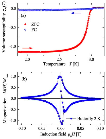 The lower panel (b) shows the field dependent magnetization (butterfly loop) of AuPdScAl between −100 mT and 100 mT at a temperature of 2 K. At this temperature, the accurate determination of the critical magnetic field is unlikely, owing to the broadening of the magnetization maximum. Additionally, flux pinning causes a more symmetric shape.