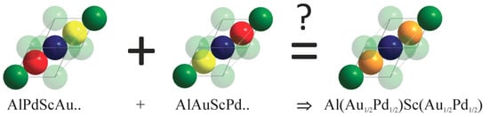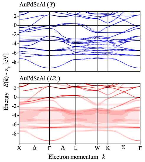 The coherent potential approximation (CPA) was used to investigate the effect of a completely random Au/Pd distribution in the electronic structure, with respect to the mean field. Figure 7 compares the Bloch spectral functions for structures Y and by assuming that chemical disorder occurs only between Au and Pd, while disregarding all other types of disorder that may be vacancies or anti-site disorder including Sc and Al. In particular, the 4d and 4c positions of the LiMgPdSn structure were occupied by 50% Au and 50% Pd, which resulted in the proposed virtual CuMnAl structure. The scheme is shown in Figure 8. The atomic distribution of the two possible atom arrangements in the primitive cell of the Y structure with symmetry were averaged such that the resulting structure appeared like with point group symmetry. Accordingly, the potential was averaged selfconsistently in the CPA. The question mark at the equality sign serves as a reminder for the fact that the inversion symmetry is lost only in the macroscopic scale, as observed by XRD.