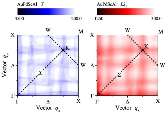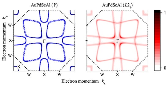 Figure 10 shows the autocorrelation function () of the Fermi surfaces in the (001) plane of the ordered and disordered AuPdScAl. The autocorrelation functions exhibit a typical, albeit physically meaningless, divergence at the point, and reflects the cubic symmetry of the crystal structures. Various maxima appeared in the autocorrelation function. Most strikingly, the maximum close to the K point is present in both situations, independent on the disorder. Specifically, it appeared at and for the ordered and disordered structure, respectively. This corresponds to a nesting vector of approximately . With a slight variation in the band filling (valence electron concentration), the nesting vector will coincide with the K point. This situation may have forced the appearance of a charge density wave as a trigger for the super conductivity, as has been reported for the (PtPd)LuIn series of Heusler compounds [].