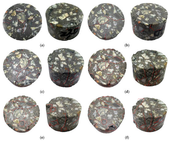 Deterioration characteristics of concrete specimens under freeze-thaw actions. (a) 10 freeze-thaw cycles; (b) 20 freeze-thaw cycles; (c) 30 freeze-thaw cycles; (d) 40 freeze-thaw cycles; (e) 50 freeze-thaw cycles; (f) 60 freeze-thaw cycles.