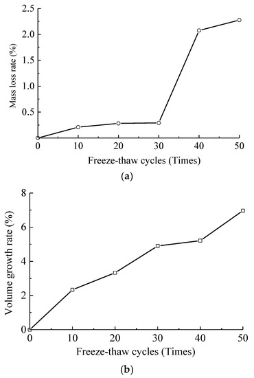As found in Figure 2a, since the spalling of aggregates, colloids and concrete blocks occurring in the freeze-thaw cycle test, the mass of specimens decreased, and the mass loss rate of specimens increased with the increase of freeze-thaw cycles consequentially. When the freeze-thaw cycles ranged from 10 to 30 times, the mass loss rates of specimens were 0.21%, 0.28% and 0.29%, respectively, and the mass loss rate changed slowly in this process. However, when it reached 40 freeze-thaw cycles, the mass loss rate was rapidly increased to 2.08%. This was because the concrete specimens began to produce a large spalling area of aggregates, colloids, even blocks at this moment, and the deterioration was more serious. While the freeze-thaw cycle number rose to 50 times, the mass loss rate was raised to 2.28%.