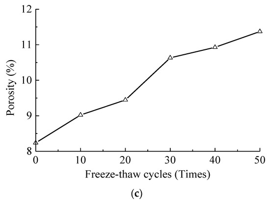 As indicated in Figure 2b,c, the volume and the porosity of concrete enlarged linearly with the increase of the freeze-thaw cycles. As the freeze-thaw cycles varied from 10 to 50, the volume growth rates enlarged from 2.34% to 3.33%, 4.90%, 5.21%, 6.97% respectively, and the porosity improved from 8.24% (the porosity without freeze-thaw cycle action, namely the initial porosity) to 9.02%, 9.44%, 10.63%, 10.93% and 11.37% respectively. During the freeze-thaw process, the alternating action of water and ice makes the pores inside the concrete increase continuously. The volume after water into ice expands due to the action of frost heaving force, thus expands the number and width of the cracks and pores. After the ice melts into water, the water enters into the newly formed cracks. It is this repeated freeze-thaw cycle process that is the increase process of the volume and the porosity of concrete.