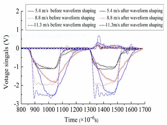 In order to reduce the dispersion effect caused by the transverse inertial movement of bar particles and extend the time before incident pulse reaches the peak value, the waveform shaping should be considered to ensure there is sufficient time for specimens to achieve the stress uniformity before failure [22]. In this paper, a large number of tests were carried out on red copper pieces of different sizes, and the wave forms before and after shaping were compared and analyzed, just as shown in Figure 4. Finally, wave shapers suitable for different working conditions were selected, that was, when the impact loading speed was 5.4 m/s, 8.8 m/s and 11.3 m/s, the thickness of the shaper was 1 mm, and the diameter was 25 mm, 20 mm and 15 mm respectively. Before the dynamic test, the concrete specimen was sandwiched between the incident bar and transmitted bar, and the molybdenum disulfide lubricant was coated between the specimen and section of incident/transmitted bar to reduce the friction effect and the energy consumed by friction. After the pressure was loaded, the valve was manually opened and closed.