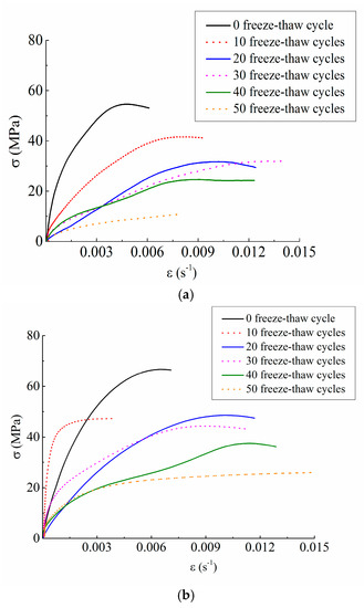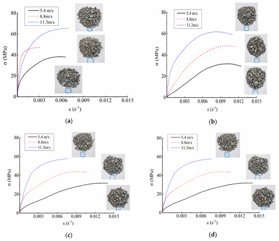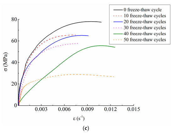 As can be seen from Figure 5, the concrete showed obvious strain rate strengthening effect under any freeze-thaw cycle condition. For example, when under the condition of 0 freeze-thaw cycle, the peak stress was 55.10 MPa at the impact loading speed of 5.4 m/s, and was 68.03 MPa and 79.05 MPa at the impact loading speed of 8.8 m/s and 11.3 m/s, respectively, increasing by 23.47% and 43.47% respectively. When under the condition of 50 freeze-thaw cycles, the peak stress was 16.29 MPa at the impact loading speed of 5.4 m/s and was 27.31 MPa and 29.70 MPa at the impact loading speed of 8.8 m/s and 11.3 m/s, respectively, increasing by 67.65% and 82.32% respectively. Thus, it can be drawn that the dynamic strength of concrete has obvious rate correlation.