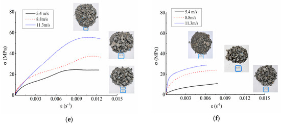Dynamic failure modes and stress-strain curves of concrete at different impact speeds. (a) 0 freeze-thaw cycle; (b) 10 freeze-thaw cycles; (c) 20 freeze-thaw cycles; (d) 30 freeze-thaw cycles; (e) 40 freeze-thaw cycles; (f) 50 freeze-thaw cycles.