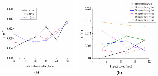 Variation rules of dynamic peak strain with freeze-thaw cycles and impact loading speed. (a) Variation rules of dynamic peak strain with freeze-thaw cycles; (b) variation rules of dynamic peak strain with impact loading speed.