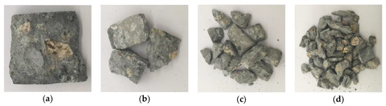 The concrete crushing blocks were collected after the impact test and the screening statistical test was conducted on the ZBSX-92a standard vibrator (Xingye Test Instrument Co., Ltd., Cangzhou, China). The diameter of the sieve holes are 0.5 mm, 1 mm, 2.36 mm, 4.75 mm, 9.6 mm, 16 mm and 19 mm respectively. The pendulum instrument shakes 221 times and vibrates 147 times per minute, with the swing of 25 mm. The motor is 1400 revolutions per minute. Fragments of all particle sizes can be effectively separated through the sieve. Taking the condition of 0 freeze-thaw cycle with loading speed of 5.4 m/s as an example, the crushing blocks of different particle sizes were shown in Figure 8. After the screening test, weighed the mass of objects under each stage with high sensitivity electronic scale and recorded the test data.