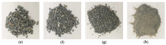 Particle size distribution of crushing blocks under the condition of 0 freeze-thaw cycle with loading speed of 5.4 m/s. (a) Greater than 19 mm; (b) 16~19 mm; (c) 9.6~16 mm; (d) 4.75~9.6 mm; (e) 2.36~4.75 mm; (f) 1~2.36 mm; (g) 0.5~1 mm; (h) Smaller than 0.5 mm.