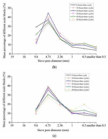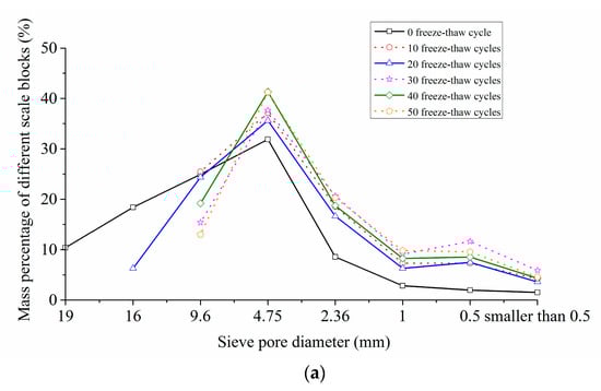 It also can be found from Table 5 and Figure 9 that, when at a certain loading rate, with the increase of the freeze-thaw cycles, the mass percentage of large particle size blocks decreased gradually, and that of small particle size blocks increased consequently. For instance, when the loading speed was 5.4 m/s, and the freeze-thaw cycles were 0 and 50 respectively, the particle mass percentages greater than or equal to 9.6 mm were 53.73% and 13.00% respectively, and those less than or equal to 4.75 mm were 46.75% and 85.56% respectively. This meant that the more freeze-thaw cycles the concrete experienced, the more serious the concrete damage was.