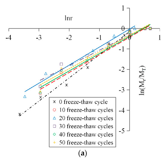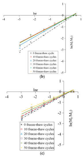 It can be found in Figure 10 that all data points under different working conditions showed a good linear correlation in the lnr–ln (Mr/MT) coordinate system, indicating that the distribution of the concrete fragments had fractal characteristics. This is because the distribution of the mesoscopic cracks and pores inside the concrete conforms to the fractal theory, and has self-similarity under different scales. The freeze-thaw deterioration and the impact crushing process are the direct results of crack extension, thus the crushing blocks of specimens suffered different freeze-thaw cycles and impact loadings also show a certain self-similarity, that is, they satisfy the power law characteristics and it is a fractal of statistical significance. In summary, the concrete material has fractal properties from the microscopic damage to the macroscopic fracture, and the larger the fractal dimension is, the more fragments there are, the smaller the fragment size is, and the more serious the material breakage is.