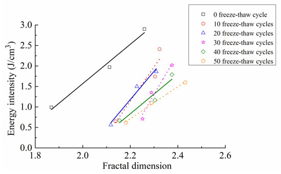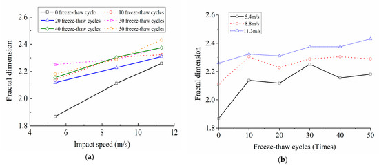 As can be found in Figure 14, when the number of freeze-thaw cycles was constant, the energy consumption density of concrete under three different impact loading speeds increased with the increase of the fractal dimension, suggesting that the more energy the specimen absorbed, the more developed the crack was, and the more thorough the specimen destruction was. In addition, when the impact loading speed was constant, with the growth of the freeze-thaw cycles, the energy consumption density reduced under a same fractal dimension condition, while the fractal dimension improved under a same energy consumption density condition, indicating that freeze-thaw cycle actions had obvious damage and deterioration effects on the concrete materials.