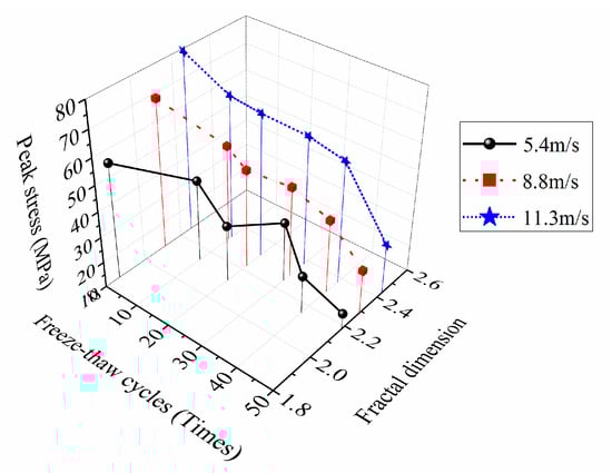 Figure 12 suggested that, when under a certain loading rate, the more freeze-thaw cycles the concrete suffered, the higher the damage degree was, the worse the mechanical property was, the lager the fractal dimension of crushing blocks was, and the smaller the dynamic peak stress was. In addition, Figure 12 also illustrated that, when under the same freeze-thaw cycle condition, although the fractal dimension increased with the increase of the loading speed due to the obvious rate correlation of the concrete dynamic strength, the dynamic peak stress tended to increase, nevertheless. Thus we can draw a conclusion that the distribution rules of concrete dynamic peak stress varying with the fractal dimension is coupling affected by the freeze-thaw cycles and the loading speed, and this is a coupling mechanism in which freeze-thaw deterioration effect and strain rate strengthening effect coexist and compete.