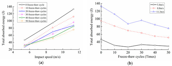 Relation curves of the total absorption energy with freeze-thaw cycles and impact loading speeds. (a) Relation curves of the total absorption energy with impact loading speeds; (b) Relation curves of the total absorption energy with freeze-thaw cycles.