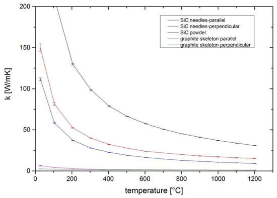 The structure of the source material can also be regarded as a composite of pores and solid SiC. In a previous study [19], Kulkarni and Brady described the thermal conductivity of composites in analogy to an electrical resistor model dependent on the orientation of fibers in a matrix. To utilize this analogy, in the case of heat flow perpendicular to the needle orientation, the source material can be regarded as a series connection of thermal resistances of the SiC needles and the pores. The thermal resistance is inversely proportional to the thermal conductivity, and therefore the thermal conductivity ks for the composite is calculated by: