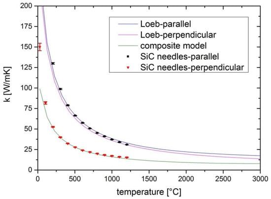 Measured thermal conductivities of the samples taken from the used source material. The red triangles denote the sample prepared with the SiC needles perpendicular to the heat flow and the black squares indicate the sample prepared with the SiC needles parallel to the heat flow in the laser flash experiment. The blue and purple lines denote the application of the Loeb model [18] in the parallel case and in the perpendicular case, respectively. The green line represents the composite model taken from a previous study [19].