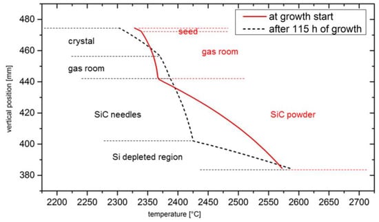 Comparison of the temperatures inside the crucible in the beginning (red line) of the experiment with the temperatures after 115 h of growth (dotted black line). The temperatures were taken in the vertical direction in the rotational center of the crucible from the bottom of the powder to the backside of the crystal. The horizontal lines indicate the boundaries between different types of materials in the crucible.