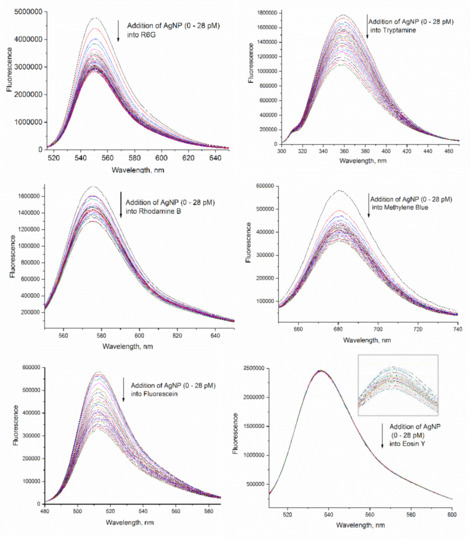 Figure 1. Fluorescence quenching of 1 μM dye solutions upon addition of various amounts of 240 pM AgNP. The insert for eosin Y shows the enlarged detail of fluorescence peaks, where comparatively weak quenching is observed.