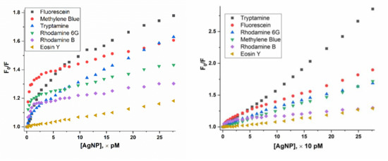 In the case of 1 µM dye solution, the F0/F of methylene blue and rhodamine B increases sharply at the initial stage followed by a distinct turn for a slower increase at the AgNP concentration around 1–2 pM, the same way as that of R6G. As we proposed for R6G, where a micelle-like self-assembly is formed with 210,000 R6G molecules assembling on the surface of one AgNP [27], we believe methylene blue and rhodamine B molecules also assemble on the surface of AgNP under these conditions to form such micelles. As for eosin Y, the fluorescence quenching is at the very minimum. The plot for tryptamine and fluorescein, whose fluorescence ratios increase slowly, but steadily. Ultimately, they reach the highest quenching among all dyes tested.