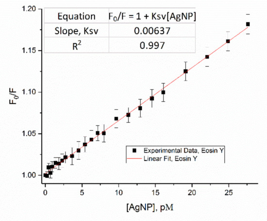 For eosin Y, its fluorescence-quenching plot, F0/F verse [AgNP], fits very well to the Stern-Volmer equation (Figure 3), with Ksv of 6.4 nM−1 of [AgNP], or 15,000 M−1 of [Ag] based on the estimate that one AgNP of 24 nm has about 420,000 Ag atoms.