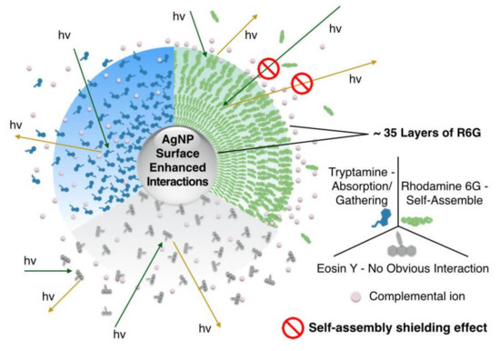 For dye molecules that have loose or no obvious interaction with AgNPs, like eosin Y in Figure 5, the pathway of light is not completely blocked so that its fluorescence quenching is mainly caused by electron transfer, FRET and/or NSET. Some organic molecules show a fluorescence quenching efficiency between R6G and eosin Y, indicating they have a gathering around AgNP but it is not as dense/thick, nor as well-organized as that of R6G. Self-assembly shielding effect may also be involved but it is not that obvious.