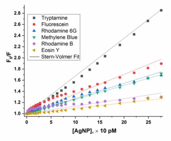 It is obvious that the self-assembly of dye molecules on AgNP surface is concentration dependent; and it only occurs at low concentrations for both AgNP and dyes. For the dye solutions of 10 µM, all quenching plots fit to a pseudo Stern-Volmer plot (Figure 6) with Ksv values of 10–68 nM−1 [AgNP] (Table 4), higher than those constants for dyes in the 1 µM solutions. Such large Stern-Volmer quenching constants still indicate super-quenching. At the [AgNP] /[dye] ratio of 30, the quenching strength from the most to the least quenched dyes are: fluorescein > tryptamine ≈ methylene blue > rhodamine 6G > rhodamine B > eison Y for 1 µM dye solutions; and tryptamine > fluorescein > methylene blue ≈ rhodamine 6G > rhodamine B ≈ eison Y for 10 μM dye solutions. It is obvious that concentration plays an important role on fluorescence quenching by AgNP.