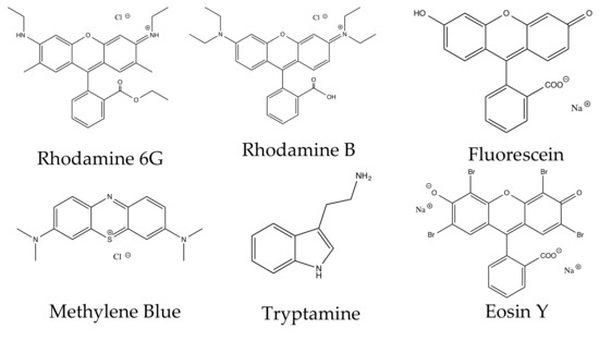 Previously, we reported a micelle-like structure formation between R6G molecules and AgNP utilizing fluorescence titration [27]. Each “micelle” consists of approximately 210,000 R6G molecules assembling on a single 24 nm AgNP surface under certain conditions. The size growth from citrate-coated AgNP (24 nm) to micelles (170 nm) and micelle agglomerates (370 nm) was confirmed by dynamic light scattering (DLS). In order to understand whether this kind of self-assembly is applicable in other dye molecules and the factors govern such formation, we choose five more dye molecules, rhodamine B, methylene blue, fluorescein, eosin Y and tryptamine with distinct structural features, to study their interaction with AgNP through fluorescence titration, a method also used to investigate interactions between proteins and metal NP [28,29].