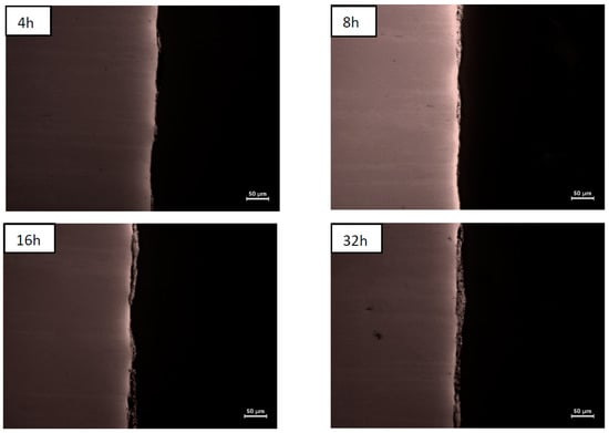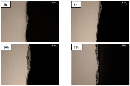 Optical microscopy observations of sections of platelets confirmed that the coverage of their surfaces is discontinuous up to 4 and 16 h of milling, for nickel and steel material, respectively (Figure 3 and Figure 4). The longer milling times indeed allowed for their full coverage producing coatings of average thickness increasing steadily, even as their local thickness and porosity vary to a large extent (Table 1).