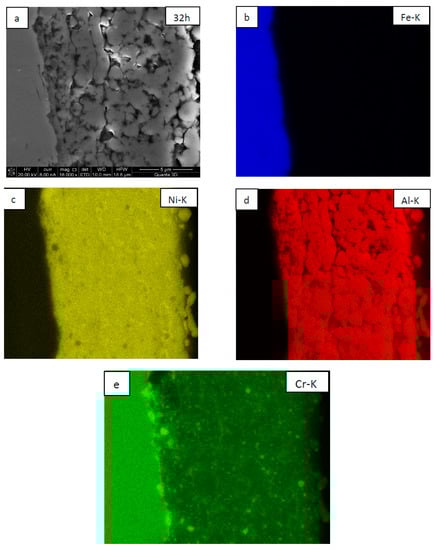 SEM/BSE image of NiAl + CrB2 coatings deposited on steel substrate after 32 h of milling (a) and maps presenting the distribution of iron (b), nickel (c), aluminum (d), and chromium (e).