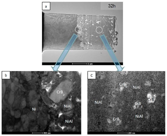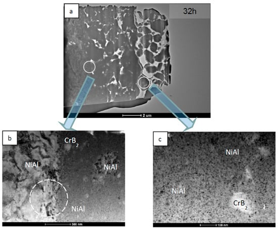 TEM investigations of the coatings deposited on the nickel substrates helped to establish that even after 32 h of milling some larger CrB2 crystallites of size approaching 0.5 µm, or even more, are either pushed into the Ni substrate or adhere to it, surrounded by NiAl particles similar in size (Figure 7a,b). The Ni substrate adjoining to the interface was highly deformed as documented by the presence of dislocation cells elongated up to ~1 µm. The interface itself is strongly corrugated with upheavals reaching up to ~0.5 mm. The globular particles filling in the interior of the coating were characterized by the presence of numerous fine CrB2 crystallites immersed in a nanocrystalline NiAl matrix (Figure 7a,c).