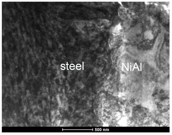 TEM image of the NiAl + CrB2 coating deposited on steel substrate after 32 h, presenting the substrate/coating interface.