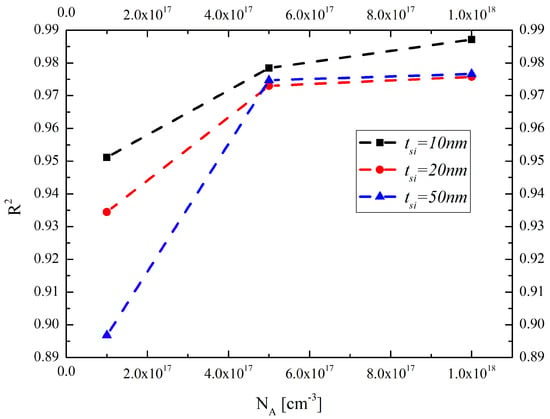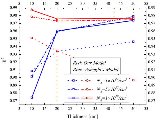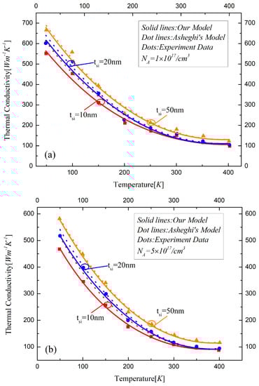 The coefficients of determination are calculated for the reliability comparison between both models. Figure 7 shows the coefficients of determination in the nonlinear regression analysis of the thermal conductivity models with different doping concentrations. The coefficients of determination of our model increase as the silicon layer thicknesses decrease and the doping concentrations increase. This is because the boundary scattering can be enhanced by decreasing the silicon layer thickness and by increasing the doping concentration. However, the coefficients of determination of Asheghi’s model decrease as the silicon thickness decreases and as the doping concentration increases. This indicates that the thermal conductivity predictive power of the Asheghi’s model degrades in the sub-10-nm thicknesses and in the heavily doped silicon layers. It can be concluded that with the thickness of the silicon layer decreasing down to sub-20 nm, the thermal conductivity prediction of our model for the doped silicon layer is more precise than that of Asheghi’s model. The values of the coefficients of determination could reach as large as 0.95 in the sub-10 nm silicon thickness regime. There is a critical silicon layer thickness point that can be used to distinguish the superiority of the two models. The thicknesses are 20 nm, 42 nm and 50 nm for the , and doped silicon layer, respectively. It can be seen that the critical silicon layer thickness increases as the increases because of the increased boundary reflection scattering.