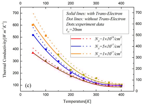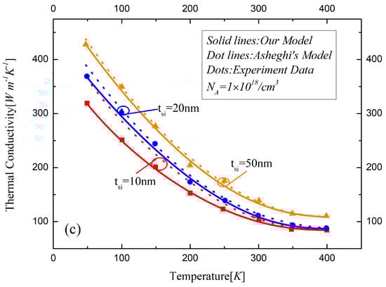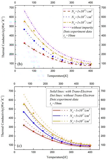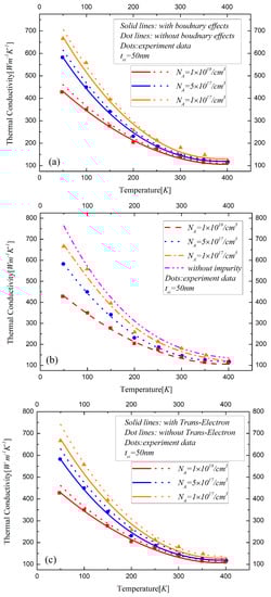 The thermal conductivity of the ultra-thin silicon film material with different thickness and various doping concentration considering the influence of temperature (a) /cm3, (b) , (c) .